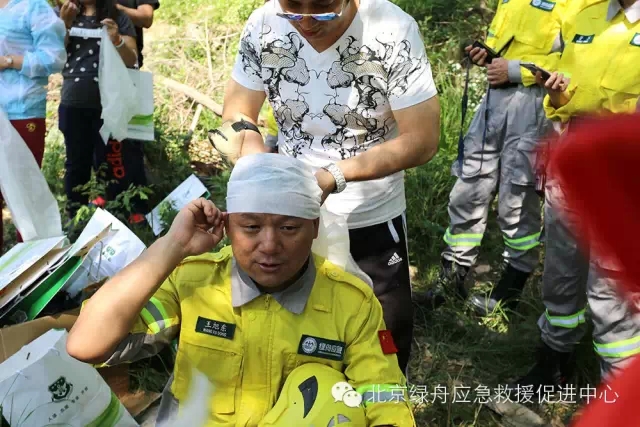 首先是发到每位社区人员手中一个急救包,然后由摩洛哥作为总教官,为大家讲解急救包中三角巾的使用方法,随后讲解了绷带的使用方法,让大家学会初步的头部包扎和肘部、膝部包扎,并在其他队员的配合下演示了如何制作简易担架并转运伤员。讲解完毕后,各组在辅导员的辅导下,开始练习头部包扎。