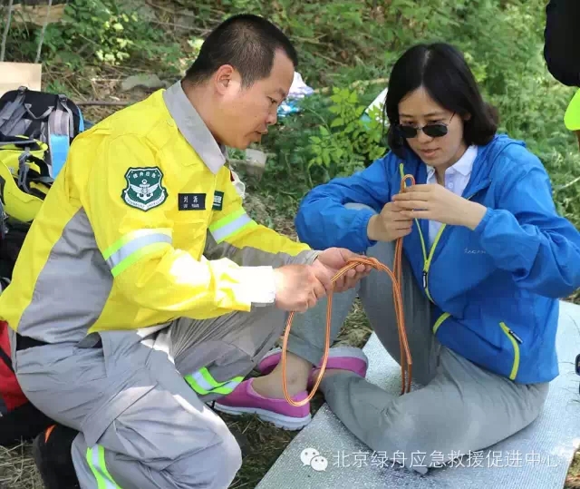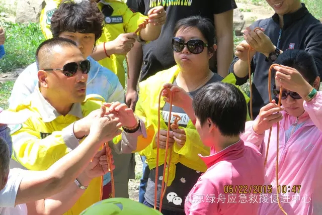 而第二环节就是绳结环节,总教官摩洛哥为大家讲解了8字结,渔人结,还以“变魔术”的方法,让社区人员了解逃生结的打结方法和应用范围。而后由各组教官分别再为本组的队员进行详细讲解和操作。在这个环节当中,绿舟应急队员向社区人员详细介绍了逃生结具体的使用方法。